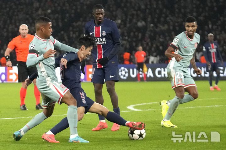 [파리=AP/뉴시스] 파리 생제르맹(PSG)의 이강인(왼쪽 두 번째)이 6일(현지시각) 프랑스 파리의 파르크 데 프랭스 경기장에서 열린 2024-25시즌 유럽축구연맹(UEFA) 챔피언스리그(UCL) 리그 페이즈 4차전 아틀레티코 마드리드(스페인)와 경기 중 공을 다투고 있다. 이강인은 후반 22분 교체 투입돼 공격포인트를 올리지 못했으며 PSG는 1-2로 역전패했다. 2024.11.07.