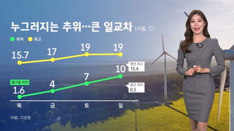 오늘 서울의 아침 기온은 1.6도로 또 한 번 올가을 최저 기록을 갈아치웠고요. 반면, 낮에는 평년 수준의 기온을 회복했습니다. 내일부터는 추위의 힘이 더 빠지겠는데요. 아침 기온이 4도로 오늘보다 2도 정도 높겠고, 기온은 갈수록 오르면서 주말 낮에는 19도까지 치솟겠습니다. 다만, 큰 일교차에 대비해 아침저녁으로 입을 따뜻한 겉옷은 챙기셔야겠습니다.