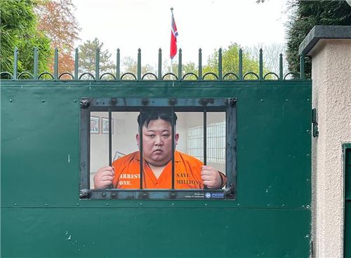 부착된 광고 포스터는 수의를 입은 김 위원장이 철창 속에 갇힌 듯한 모습과 함께 '한 명만 구속되면 수백만 명이 해방될 수 있다'는 의미의 영문 글귀(ARREST ONE, SAVE MILLIONS)가 담겼다.