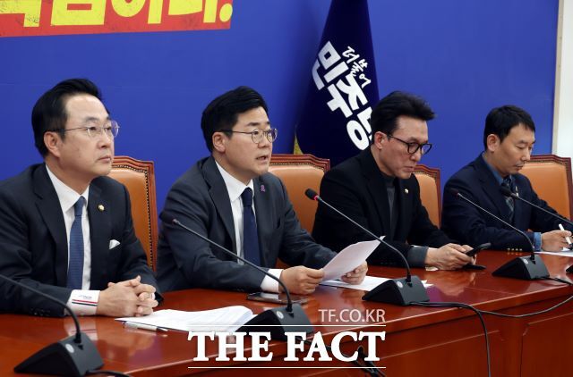 더불어민주당이 7일 윤석열 대통령의 기자회견을 혹평하며 김건희 특검법 관철 의지를 다졌다. 박찬대 더불어민주당 원내대표와 김민석 최고위원 등 원내지도부가 7일 서울 여의도 국회에서 윤석열 대통령 기자회견 관련 입장 표명을 하고 있다. /뉴시스 |