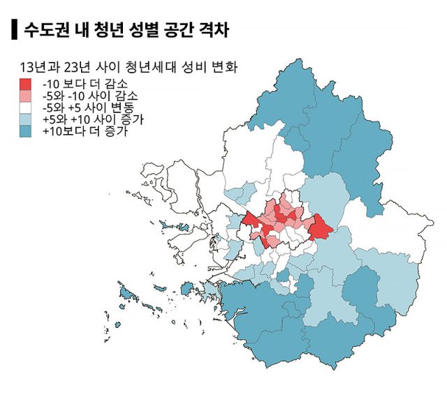 2013년 서울 강남구의 성비는 87.0이었고, 옹진군의 성비는 205.2였으나 2023년에는 서울 마포구의 성비가 82.5로 더 낮아지고, 옹진군의 성비는 247.0으로 더 높아졌다. 수도권과 비수도권 간 격차에 더해, 수도권 내부에서도 청년 남녀의 거주지가 점점 더 달라지고 있다는 것이다.