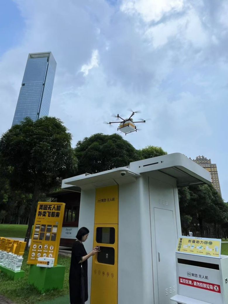 선전 도서관 등에서도 드론 배달은 시작됐다. 메이퇀은 2.3~2.5kg 적재량 이내의 드론 배송을 제공하고 있다. 이륙 지점 기준으로 사용자에게 3km, 10~15분 배송 서비스를 표준으로 삼았다. 가랑비 정도에도 운행되고 오전 8시에서 오후 4~6시 사이, -10℃ 아래로 내려가지 않으면 정상 운행이 가능하다.