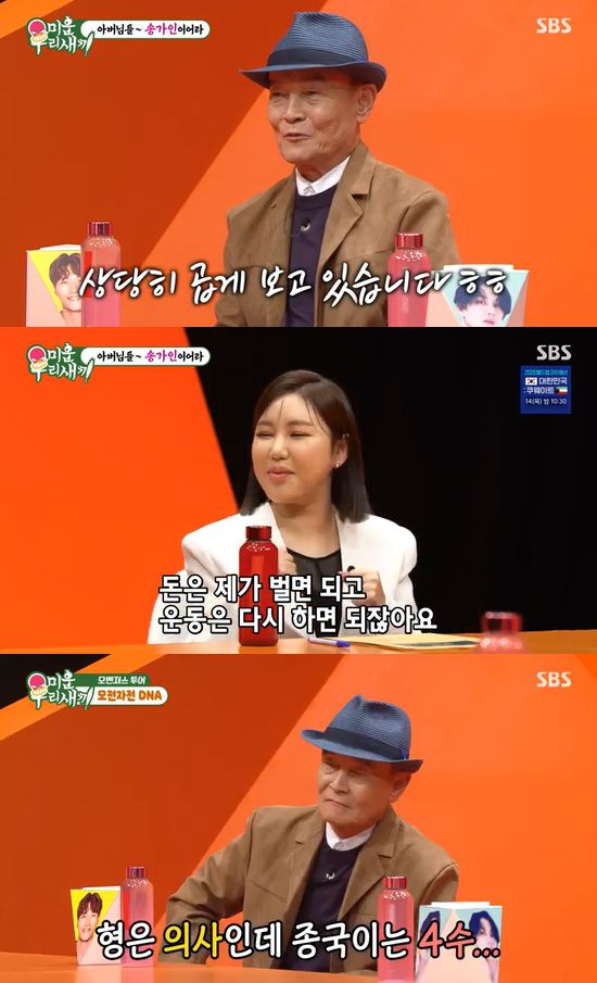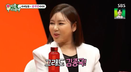 이날 신동엽은 "가인 씨 이상형이 김종국이라고 한다"라며 송가인의 이상형을 밝혔다. 이어 김종국의 아버지에 "가인 씨같은 며느리가 집에 들어온다면 어떨 것 같냐"라고 물었다.