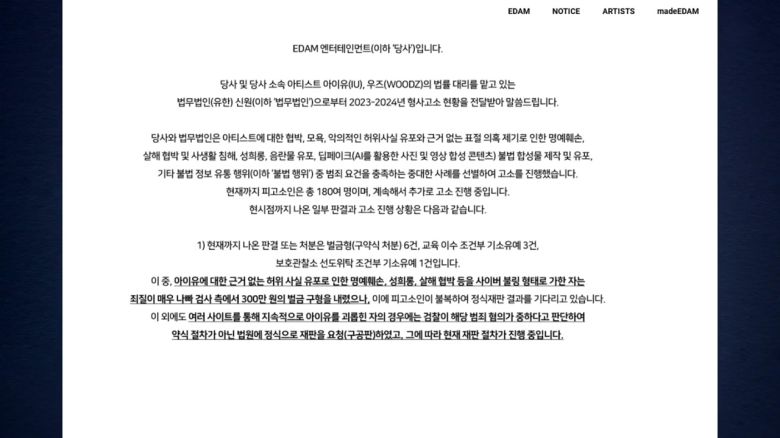 가수 아이유 소속사가 협박이나 명예훼손, 허위사실 유포와 불법 합성물 제작 등으로 아이유에게 피해를 준 180여 명을 고소했다고 밝혔습니다.