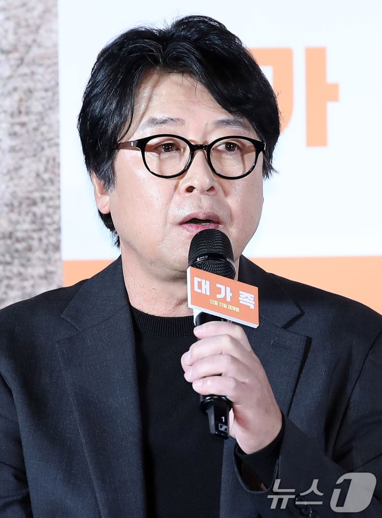 (서울=뉴스1) 권현진 기자 = 배우 김윤석이 12일 서울 광진구 롯데시네마 건대입구에서 열린 영화 '대가족'(감독 양우석) 제작보고회에서 인사말을 하고 있다. '대가족'은 스님이 된 아들 함문석(이승기 분) 때문에 대가 끊긴 만두 맛집 평만옥 사장 함무옥(김윤석 분)에게 세상 본 적 없던 귀여운 손주들이 찾아오면서 생각지도 못한 기막힌 동거 생활을 하게 되는 가족 코미디다. 2024.11.12./뉴스1