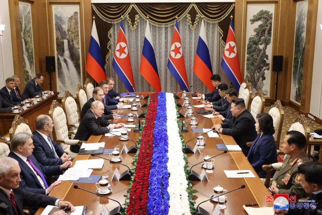 김정은 북한 국무위원장과 블라디미르 푸틴 러시아 대통령이 지난 19일 금수산영빈관에서 회담이 진행됐다고 조선중앙통신이 20일 보도했다. /연합 |
