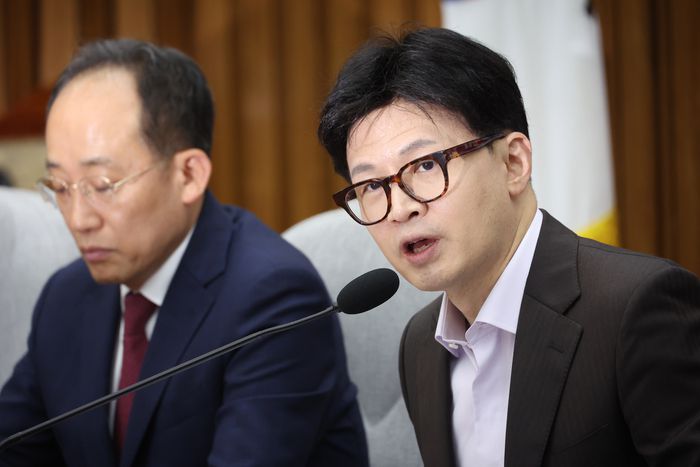 국민의힘 한동훈 대표가 12일 국회에서 열린 ‘이재명 민주당의 사법방해저지 긴급대책회의’에서 발언을 하고 있다. [사진출처 = 연합뉴스] |
