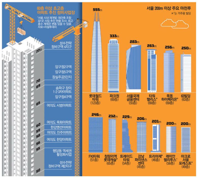 현재 서울 최고층 아파트는 강남구 도곡동 '타워팰리스3차'와 양천구 목동 '현대하이페리온1차'로 각 69층이다. 서울에서 200m가 넘는 초고층 주거 전용 단지는 6개에 불과하다.