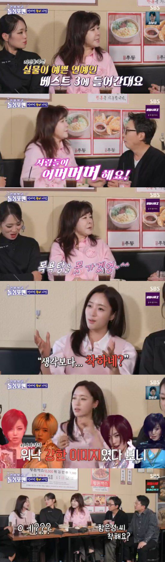 함은정도 자신의 실물 후기를 전했다. 함은정은 "제가 티아라 때 아이라인을 진하게 그렸었다. 그랬더니 저를 실제로 보시면 '생각보다 착하네? 생각보다 수더분하게 생겼네?'라는 반응이 많다"고 전했다.