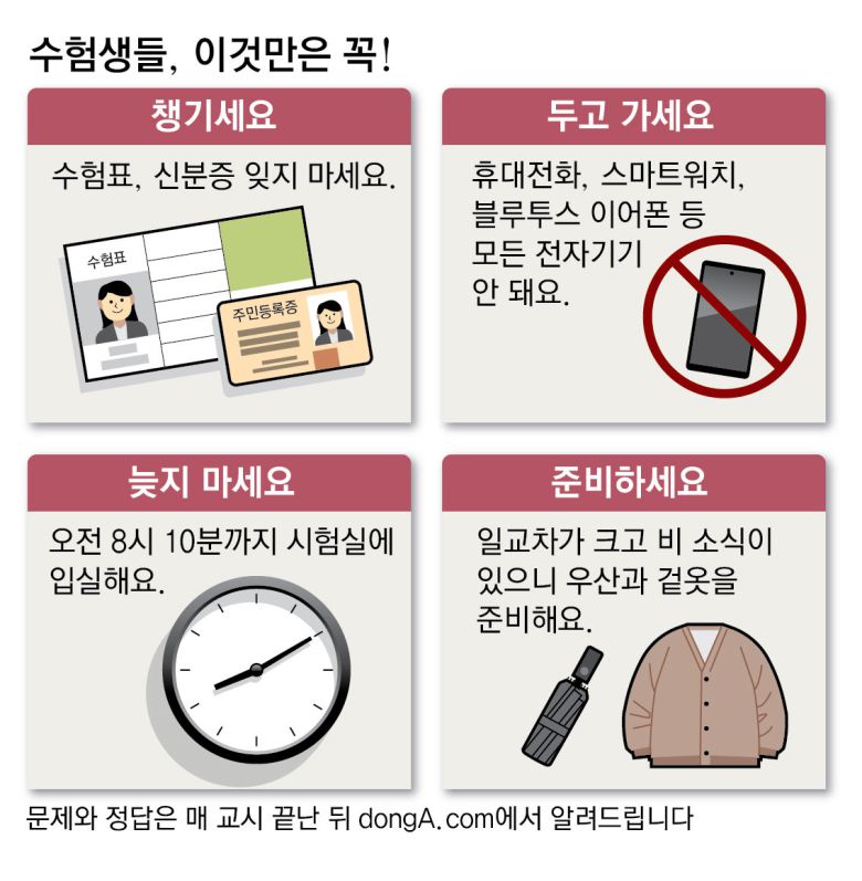 2025학년도 대학수학능력시험(수능)이 14일 전국 1282개 시험장에서 실시된다. 수능 당일 수험생은 수험표와 사진이 부착된 신분증을 갖고 오전 8시 10분까지 고사실에 입실해야 한다. 수험표를 분실한 경우 오전 8시까지 시험장 내 관리본부로 찾아가면 재발급받을 수 있다.