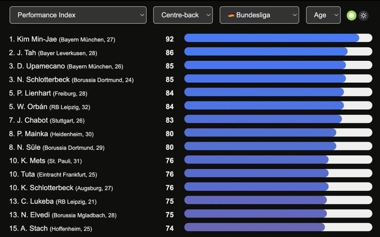 ​(엑스포츠뉴스 김현기 기자) 국제축구연맹(FIFA) 산하 기관에서 전세계 센터백 중 1위를 인증받은 김민재가 이번 시즌 독일 분데스리가 중앙 수비수 순위에서도 가볍게 1위를 찍은 것으로 드러났다.