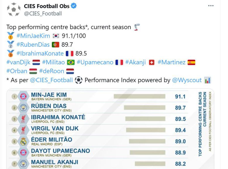 CIES는 자체 지표로 경기력을 분석한 뒤 김민재에게 100점 만점에 91.1점을 매겼다. 김민재는 전세계 센터백 중 유일하게 90점을 돌파했다.