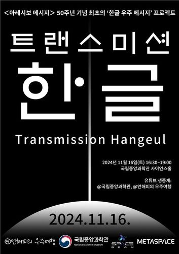 국립중앙과학관은 이날 대전 유성구 본관 사이언스홀에서 한국 천문학자들과 예술가들이 만든 한국 첫 우주메시지 '트랜스미션 한글'을 우주에 전송하는 행사를 연다고 밝혔다.