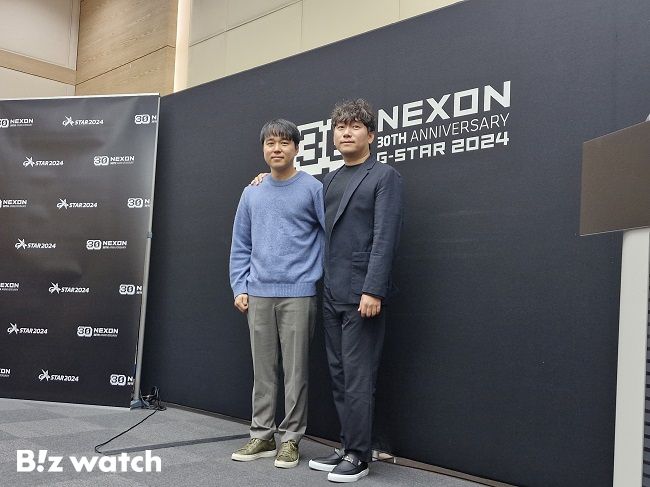 넥슨 자회사 네오플의 윤명진 대표(오른쪽)와 박정완 '프로젝트 오버킬' 크리에이티브 디렉터가 14일 부산 벡스코(BEXCO) 제2전시장에서 열린 기자 간담회 자리에서 포즈를 취하고 있다./사진=한수연 기자 papyrus@ |