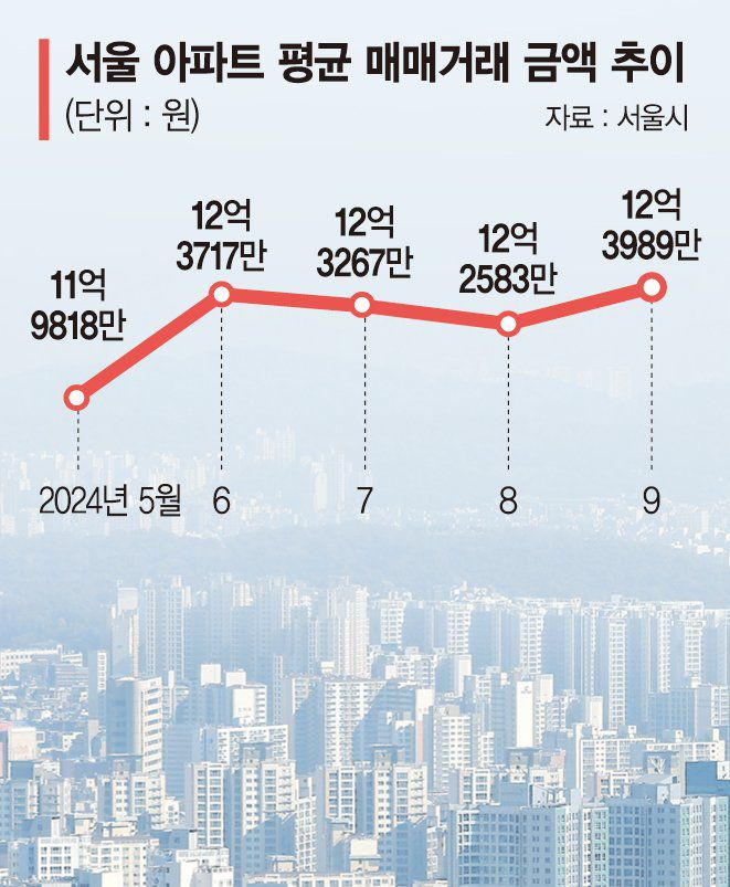 14일 서울시에 따르면 지난 9월 서울 아파트 매매 평균거래금액은 12억3989만원으로 집계됐다. 이는 종전 역대 최고치인 지난 6월(12억3267만원) 수치를 뛰어넘는 금액이다. 서울 아파트 평균 매매 거래가는 지난 6월 첫 12억원대를 돌파했다.