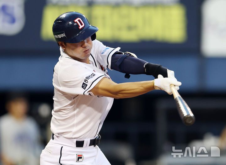 [서울=뉴시스] 김명년 기자 = 6일 오후 서울 송파구 잠실야구장에서 열린 프로야구 2024 신한 SOL 뱅크 KBO리그 두산 베어스와 LG 트윈스의 경기, 2회말 1사 주자 1,3루 상황 두산 김재호가 역전 안타를 치고 있다. 2024.08.06. kmn@newsis.com |