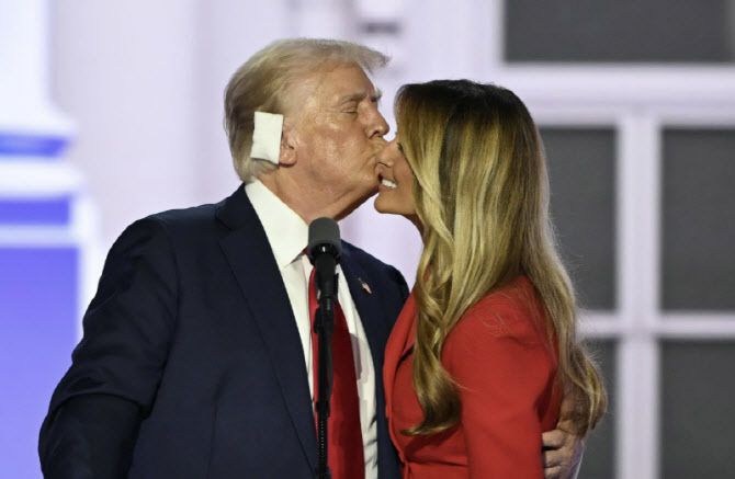 도널드 트럼프 미국 대통령 당선인이 부인 멜라니아 여사에 입맞춤을 하고 있는 모습. (사진=AFP) |