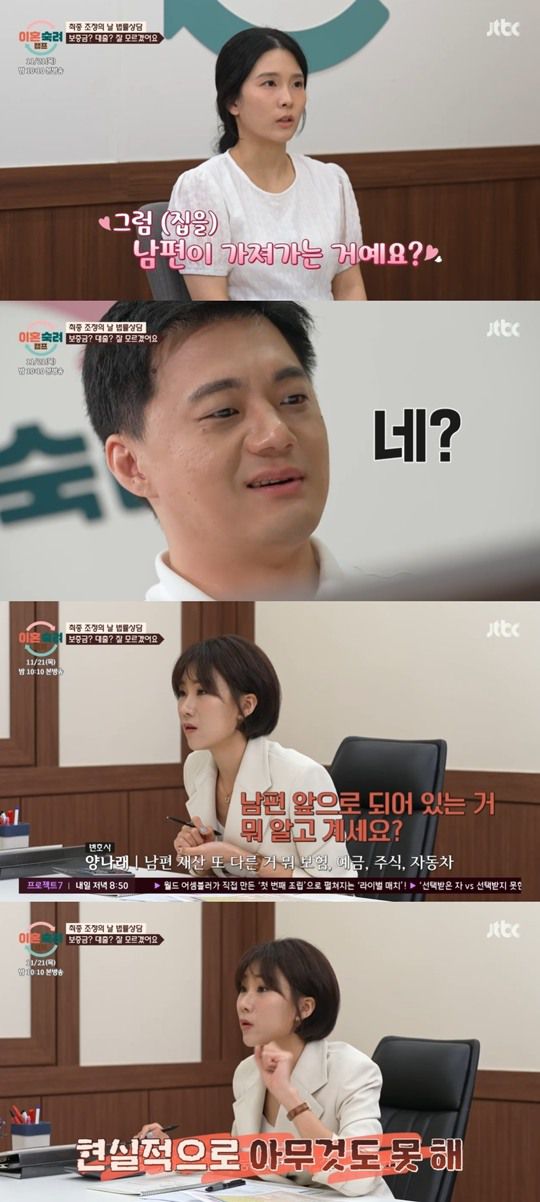 법률 상담을 통해 양나래 변호사는 “돈을 얼마씩 어떻게 부담했냐”라 질문, 아내는 “같이 부담했다. 신용카드로 했다. 잘 모르겠다”며 해맑은 모습을 보였다.