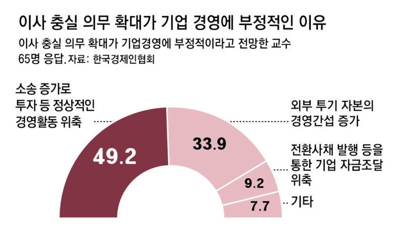 독립이사(사외이사) 규정은 실효성이 떨어지고 이사회를 위축시킬 것이란 지적도 나온다. 권재열 경희대 법학전문대학원 교수는 “독립이사를 이사회의 3분의 1까지 늘리면 규모가 작은 기업들은 사외이사를 더 선임하기 어려워 이사회를 아예 축소해 규제 요건을 억지로 맞추려 할 것”이라며 “이사회 역할을 오히려 제한하는 결과를 낳을 수 있다”고 지적했다.