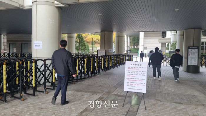서울 서초구 서울중앙지방법원 출입구 앞에 15일 “법원 경내 집회 및 시위는 금지되고 피켓·유인물· 확성기 등 단체 활동에 활용될 수 있는 물품은 반입할 수 없다”는 안내문이 공지돼 있다. 강한들 기자 |