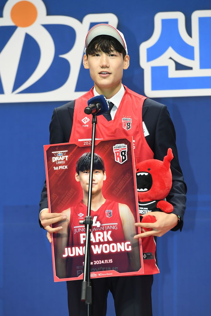 [서울=뉴시스] 김근수 기자 = 2024 KBL 신인드래프트 안양 정관장 1순위 지명자 고졸 홍대부고 박정웅이 15일 오후 고양소노아레나 체육관에서 열린 2024 KBL 신인드래프트에서 소감을 말하고 있다. (사진= KBL 제공) 2024.11.15. photo@newsis.com