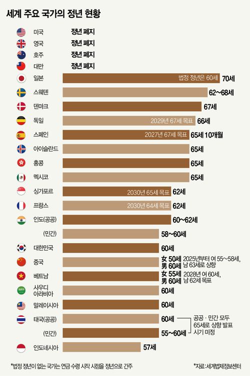 세계 주요 국가들도 고령화, 인구 감소 추세에 따라 정년 기준을 올리거나 폐지하고 있다. 미국은 1986년, 영국은 2011년 정년제를 폐지했다. 근로자 정년을 관련법으로 명시해 유지하는 국가는 경제협력개발기구(OECD) 국가 중 한국, 일본 등 소수다. 캐나다와 호주, 뉴질랜드, 덴마크, 폴란드 등 다수 국가에는 의무적인 개념의 정년은 없고 정년퇴직을 정하는 것 자체가 불법인 곳도 있다. 이들 국가 대부분은 연금 수령을 시작하는 ‘연금 수급 개시’ 연령을 사실상 정년으로 여긴다. 이 정년을 독일은 67세로, 프랑스는 64세로 차츰 올리는 추세다. 대만, 싱가포르 등 아시아의 국가도 정년 시기를 폐지하거나 연장하고 있다.