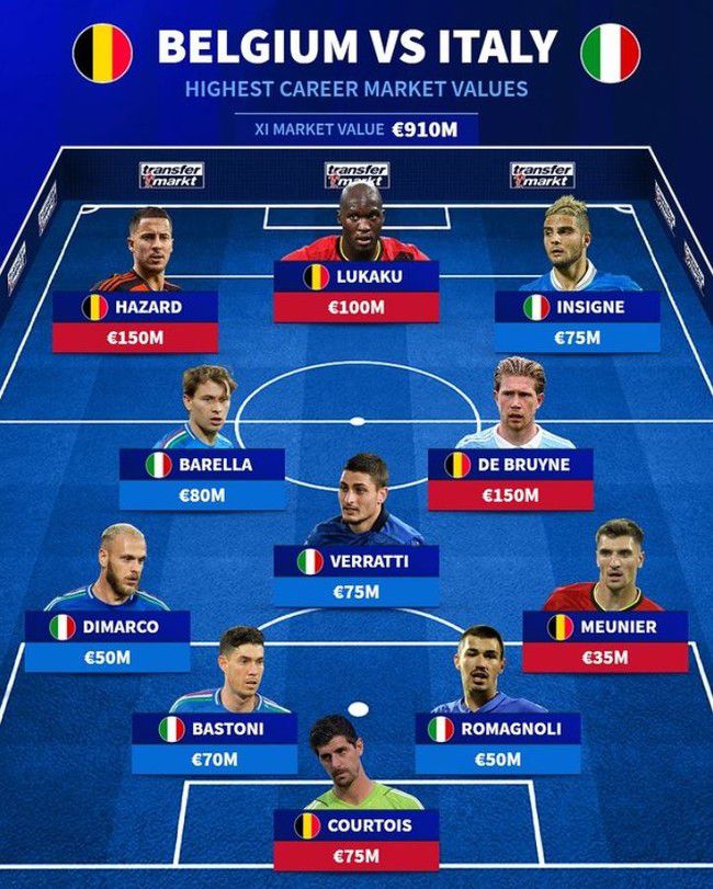 축구 통계 매체 '트랜스퍼마크트'는 15일(한국시간) 공식 SNS를 통해 벨기에, 이탈리아 통합 몸값 베스트11을 공개했다.
