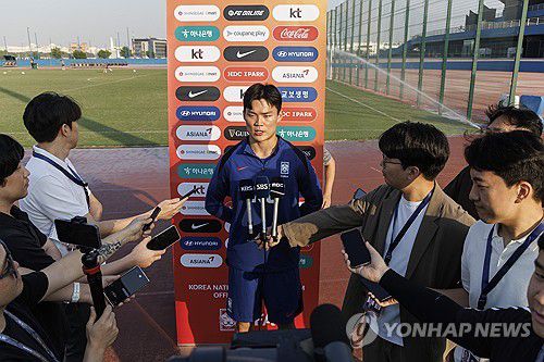 (쿠웨이트시티=연합뉴스) 황광모 기자 = 11회 연속 월드컵 본선 진출을 향해 순항 중인 한국 축구대표팀의 오현규가 16일 오후(현지시간) 쿠웨이트 자베르 알 아흐메드 국제 경기장 보조구장에서 열린 팀 훈련에서 취재진과 인터뷰를 하고 있다. 2024.11.17