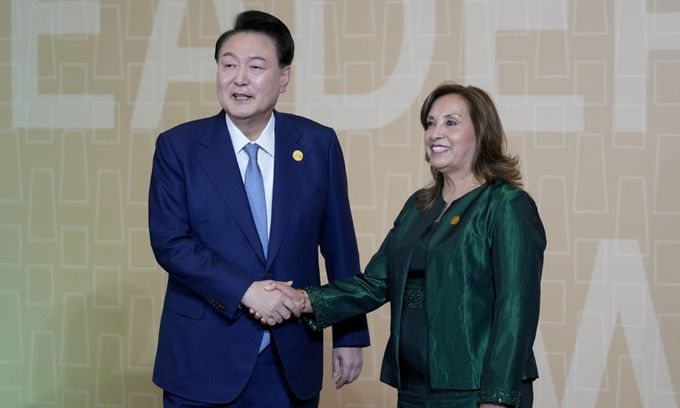윤석열 대통령이 16일(현지시각) 페루 리마에서 열린 아시아태평양경제협력체(APEC) 정상회의장에 도착해 디아 볼루아르테 페루 대통령과 악수하고 있다. AP연합뉴스