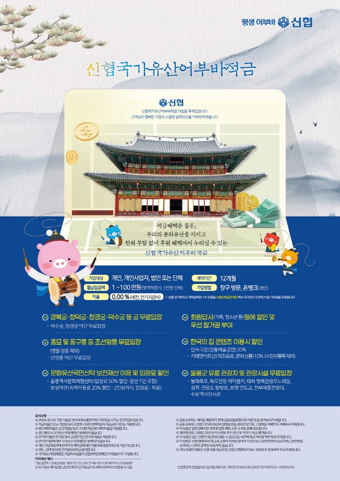 신협은 2020년부터 국가유산청(구 문화재청)과 협력해 국가유산 보호 사업을 지속적으로 추진해왔다. 올해 5월 문화재청이 국가유산청으로 개편된 것을 기념해 출시한 ‘신협국가유산어부바적금’은 조합원들이 가입만으로도 국가유산 보전에 참여할 수 있도록 개발된 상품이다.