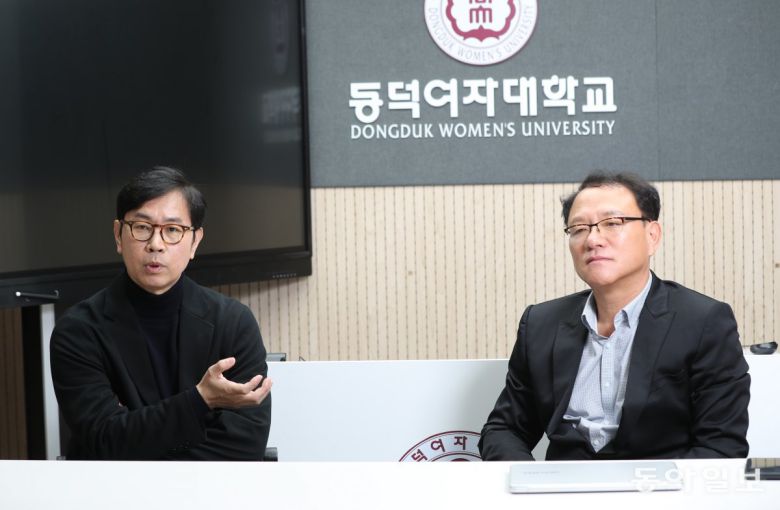 이민주 동덕여자대학교 교무처장(대학비전혁신추진단장)과 배경재 디지털혁신기획처장(왼쪽)이 15일 오전 본보와 인터뷰를 가졌다. 인터뷰 중 이 단장과 배 처장은 최근 불거진 학생들의 ‘남녀공학 전환 반대’ 시위에 대한 학교측 입장을 밝혔다. 변영욱 기자 cut@donga.com |