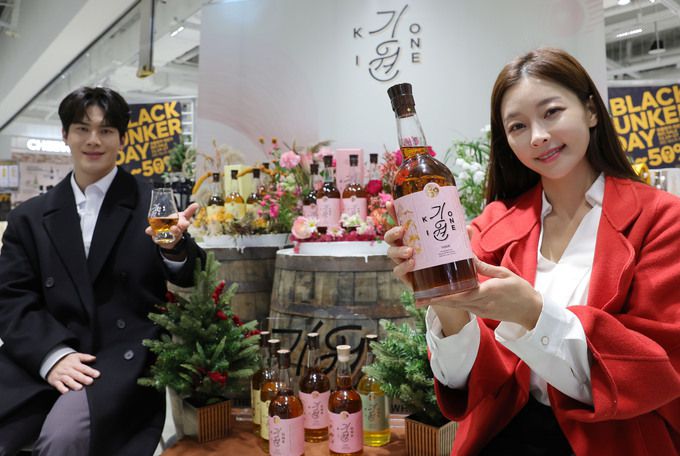 19일 서울 중구 보틀벙커 서울역점에서 모델들이 국산 싱글몰트 위스키 기원의 시그니처 라인 3종(호랑이, 독수리, 유니콘)을 선보이고 있다. 기원 시그니처 3종은 색동저고리의 한국적인 색상을 라벨에 적용해 기존 위스키들과 디자인 차별성을 두었으며 품질은 유지하고 가격을 낮춰 소비자들의 접근성을 높였다.