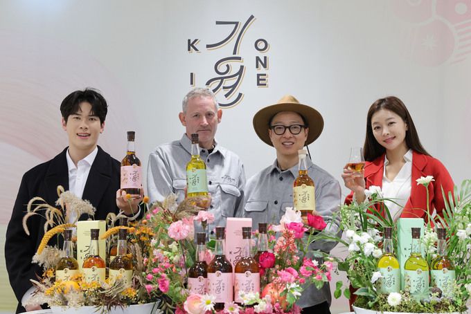 19일 서울 중구 보틀벙커 서울역점에서 앤드류 샌들 위스키 마스터 디스틸(왼쪽 두번째부터), 도정한 기원 대표와 모델들이 국산 싱글몰트 위스키 기원의 시그니처 라인 3종(호랑이, 독수리, 유니콘)을 선보이고 있다. 기원 시그니처 3종은 색동저고리의 한국적인 색상을 라벨에 적용해 기존 위스키들과 디자인 차별성을 두었으며 품질은 유지하고 가격을 낮춰 소비자들의 접근성을 높였다.