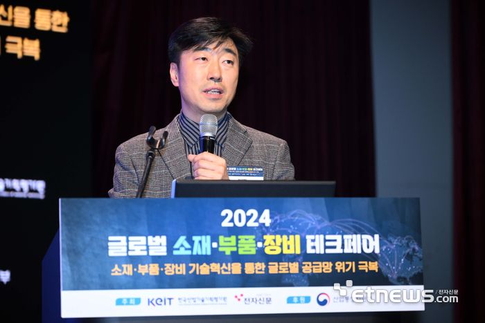 정의택 텐스토렌트 상무, ‘AI 혁신을 촉진하는 텐스토렌트 & RISC-V’ - 한국산업기술기획평가원과 전자신문이 주최하고 산업통상자원부가 후원한 '2024 글로벌 소재·부품·장비 테크페어'가 '소재·부품·장비 기술혁신을 통한 글로벌 공급망 위기 극복'을 주제로 19일 서울 강남구 코엑스에서 열렸다. 정의택 텐스토렌트 상무가 '인공지능(AI) 혁신을 촉진하는 텐스토렌트 & RISC-V'를 주제로 발표하고 있다. 김민수기자 mskim@etnews.com