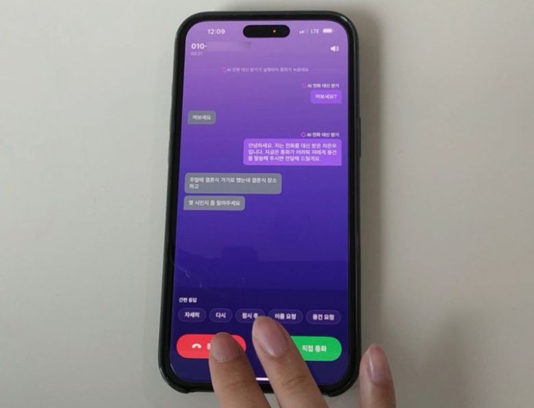 아이폰16플러스에서 LG유플러스 AI 에이전트 '익시오' 내 AI 전화 대신 받기 기능을 사용하는 모습. 사진=구자윤 기자