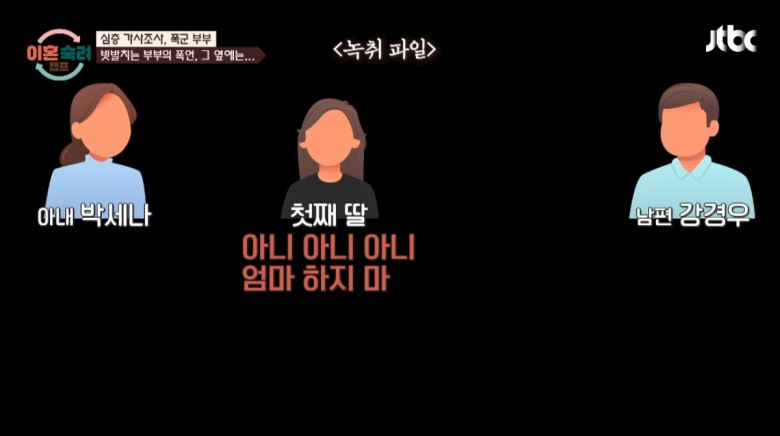 아내는 남편의 폭력이 두려워 경찰 신고까지 했다. 이들 부부의 싸움과정은 아이들도 지켜보고 있었다. 녹취록에서 첫째 딸은 "둘 다 입 그만! 하지 마"라고 말했고, 둘째 딸도 "둘 다 싸우지 마 내가 말했잖아"라고 애원했다. 남편은 큰딸에게 "아빠 이혼할 거니까 누구랑 살 거냐. 네 엄마랑 못살 것 같다"고 직접 언급해 충격을 줬다.