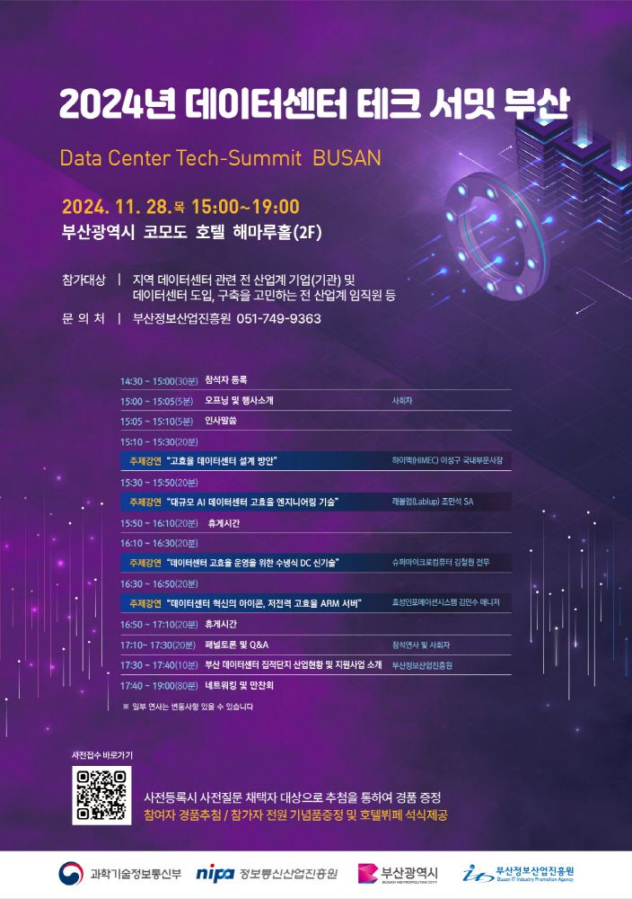 2024 데이터 센터 테크 서밋 부산은 부산정보산업진흥원이 친환경 그린 등 데이터 센터 사업 7월 공모 유치를 통해 정보통신산업진흥원(NIPA)과 부산시가 주최하는 지역 데이터 센터 집적단지 활성화 사업의 하나로 진행하는 행사이다.