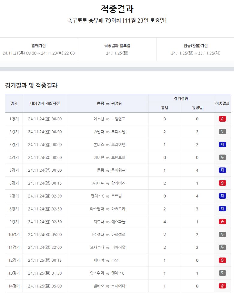 지난 23일 오후 10시에 마감된 축구토토 승무패 79회차는 24일부터 25일까지 진행된 잉글랜드 프리미어리그(EPL) 7경기 및 스페인 프리메라리가(라리가) 7경기 등 총 14경기를 대상으로 진행됐으나, 1등 적중자는 나오지 않았다.