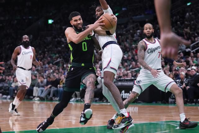 미국프로농구(NBA) 보스턴의 제이슨 테이텀(왼쪽)이 26일(한국시간) 미국 매사추세츠주 보스턴의 TD가든에서 열린 2024~25시즌 NBA LA 클리퍼스와 경기에서 골밑 돌파를 시도하고 있다. 보스턴=AP 연합뉴스 |