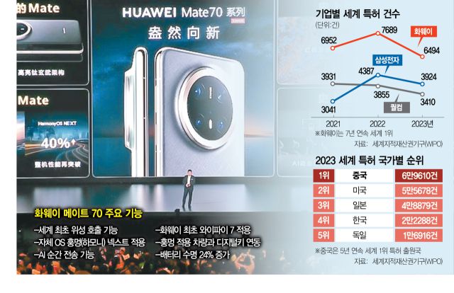 자체 기술력으로 신제품을 출시해온 화웨이는 26일 ‘메이트 70’을 통해 다시 한 번 기술 경쟁력을 과시했다. 위청둥 화웨이 최고경영자(CEO)는 “훙멍(하모니) 운영체제(OS)와 새로운 하드웨어 구성을 통해 전반적인 성능이 40배 향상됐다”고 밝혔다. 메이트 70은 사전 예약만 300만 건을 돌파했고 시장에서는 판매량이 1000만 대를 넘을 것으로 예상된다.