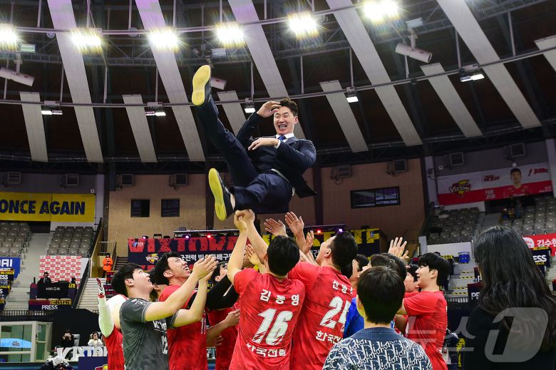 26일 은퇴식과 함께 득점 신기록상을 수상한 박철우가 한국전력 동료들의 헹가래를 받고 있다. (KOVO 제공) |