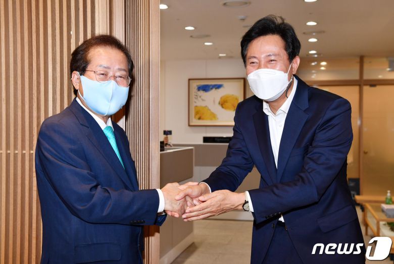 2021년 9월 당시 국민의힘 대선주자인 홍준표 의원이 서울시청을 방문, 오세훈 서울시장과 면담을 하기 전 악수하고 있다. 2021.9.14/뉴스1 ⓒ News1 국회사진취재단 |
