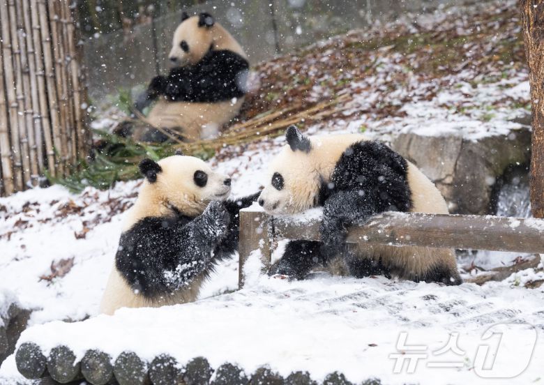 (서울=뉴스1) 김형준 기자 = 에버랜드는 쌍둥이 아기 판다 루이바오와 후이바오가 태어나서 처음으로 눈을 경험하게 됐다는 근황을 전했다.