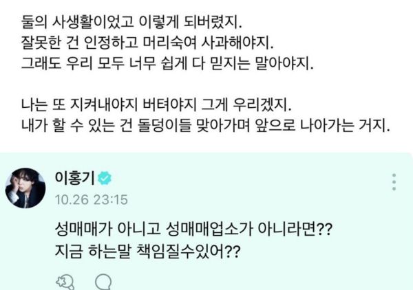 이번 율희의 폭로로 최민환은 모든 예능에서 하차했고, FT아일랜드 역시 최민환 없이 2인 체제로 활동을 펼쳤다. 하지만 당시 이홍기는 공식 팬 커뮤니티 위버스에 "둘의 사생활이었고 이렇게 돼버렸지. 잘못한 건 인정하고 머리 숙여 사과해야지. 그래도 우리 모두 너무 쉽게 다 믿지는 말아야지. 나는 또 지켜내야지. 버텨야지. 그게 우리겠지"라는 의미심장한 글을 게재했던 바.