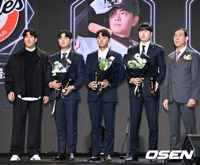 퓨처스리그 시상식에서 한화 이글스 임종찬 허인서 조동욱이 포토타임을 갖고 있다. 2024.12.01 / rumi@osen.co.kr