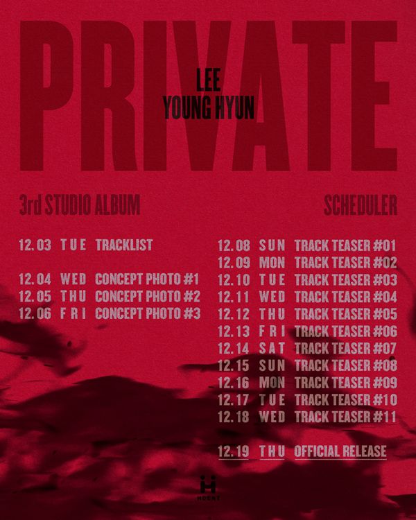 2일 0시 공식 채널을 통해 오픈된 이영현의 정규 3집 'PRIVATE' 앨범 스케줄러는 강렬한 붉은 배경 속 타오르는 불꽃의 그림자가 보다 강렬하게 돌아올 이영현의 매력을 예고하며 시선을 사로잡았다.