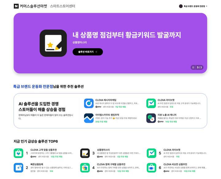 예를 들어 온라인 판매를 처음 시작해 스토어 기본 세팅 같은 기초적인 운영 관리가 고민인 초보 판매자에게는 '상품명마스터', 'CLOVA 라이브챗' 같은 관리 운영 솔루션들이 추천된다.