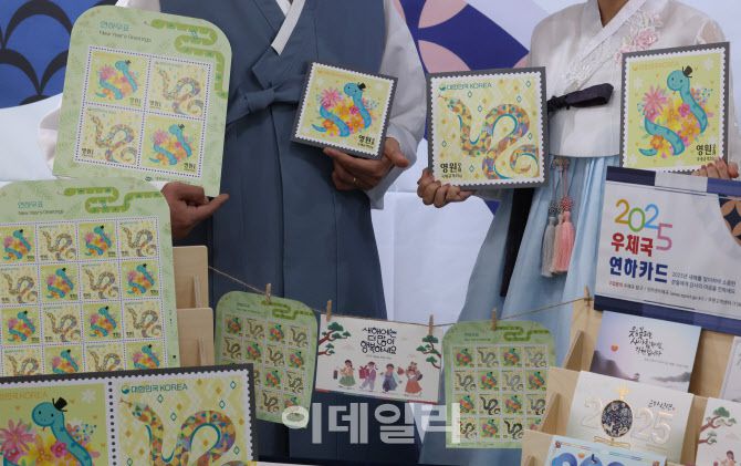 [이데일리 이영훈 기자] 우정사업본부가 2일 오전 서울 중구 우표박물관에서 열린 '2025 을사년(乙巳年)' 연하우표·연하카드를 발행해 공개하고 있다. 기념우표는 꽃을 안고 있는 푸른 뱀과 허물을 벗고 앞으로 힘차게 나아가는 뱀의 움직임을 담았다. 뱀의 몸은 홀로그램으로 인쇄해 반짝이는 새해의 염원을 표현했다. 연하카드는 다양한 뱀의 모습과 함께 희망과 행복을 전하는 디자인으로 그려졌다. 이 기사의 카테고리는 언론사의 분류를 따릅니다.0공유하기