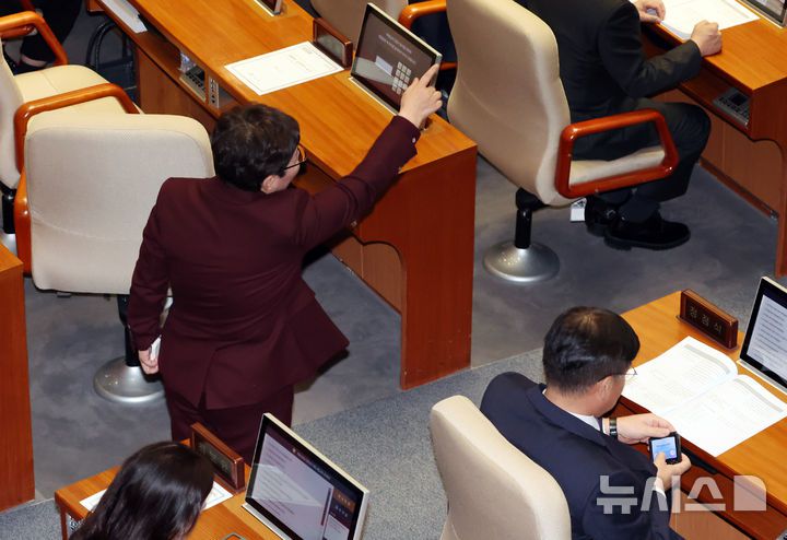 [서울=뉴시스] 고승민 기자 = 임이자 국민의힘 의원이 2일 서울 여의도 국회에서 열린 제418회 국회(정기회) 제14차 본회의에서 우원식 국회 의장을 향해 항의하고 있다. 2024.12.02. kkssmm99@newsis.com |