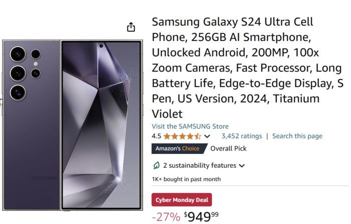 먼저 갤럭시 S24 시리즈 중에서도 최상위 모델인 갤럭시 S24 울트라(256GB)는 정가(1299.99달러) 대비 27% 할인된 가격인 949.99달러에 판매 중이다.